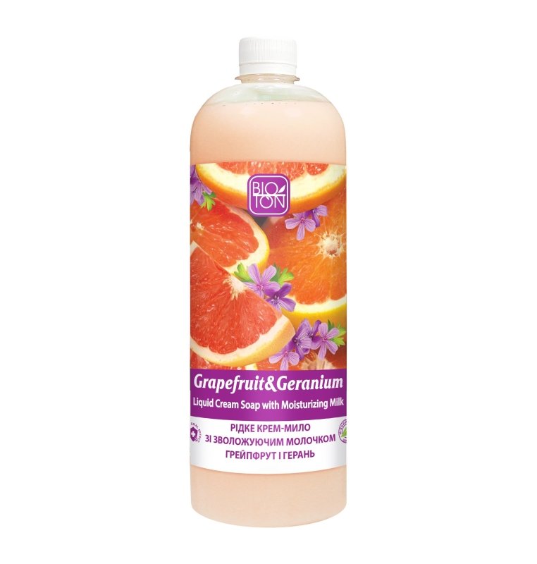 BIOTON Skystas kreminis-muilas Greipfrutas ir pelargonija su drekinamuoju pieneliu, 1 l
