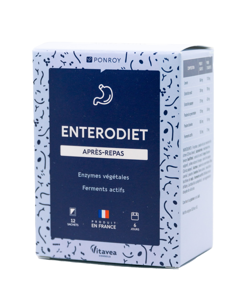 Virškinimas yra procesas, kurio metu maistas paverčiamas būtinomis maistinėmis medžiagomis tinkamam organizmo funkcionavimui. Žmogaus organizmas natūraliai gamina virškinimo fermentus, tačiau yra atvejų, kada organizmui gali pritrūkti virškinimui svarbių fermentų.  ENTERODIET formulėje yra dvi pagrindinės veikliosios medžiagos: papainas (iš papajinio melionmedžio ekstrakto) ir maltazė (iš paprastųjų miežių salyklo ekstrakto) – du augaliniai fermentai, skaidantys baltymus, angliavandenius, įskaitant krakmolą ir lipidus.  Sudėtyje taip pat paprastojo erškėčio ekstraktas, sėjamųjų avižų ląsteliena, formulę užbaigia Suprabiotic® kompleksas, sudarytas iš pieno rūgšties bakterijų Lactobacillus acidophilus ir Bifidobacterium bifidum, natūraliai virškinamajame trakte esančių padermių šeimų.