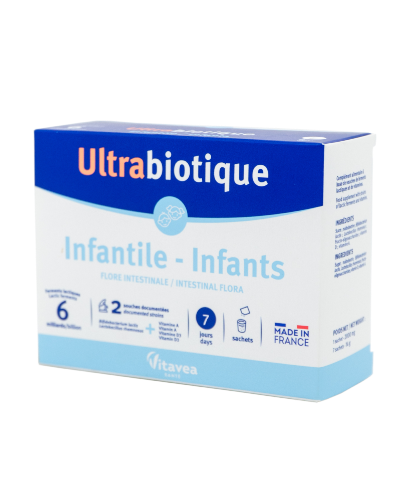 VITAVEA Ultrabiotique gerosios bakterijos vaikams formulė puikiai tinka patiems mažiausiems vaikams, nes sujungia pieno fermentus su vitaminu D3 ir vitaminu A, kad palaikytų subalansuotą žarnyno florą ir natūraliai palaikytų organizmo apsaugą.